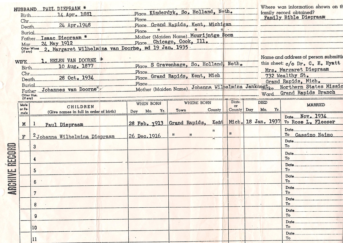 Het toont hoezeer Paulus Diepraam na zijn dood werd gezien als een vroom lid en een echte ‘heilige der laatste dagen’. Volgens de genoemde Archive Records vond zijn endowment plaats na zijn dood, namelijk op 19 augustus 1949. Of Paulus werkelijk zo’n uitzonderlijk goeie man was, weten de Nederlandse Diepramen niet. Wijlen Arie Izak Diepraam, zijn zoon, herinnerde hem nauwelijks, evenmin als zijn dochter Mourijntje. Mijn grootmoeder, Jannetje Mastenbroek, was niet overtuigd van zijn goedheid. En daardoor ook hun kleinkinderen niet, begrijpelijk.