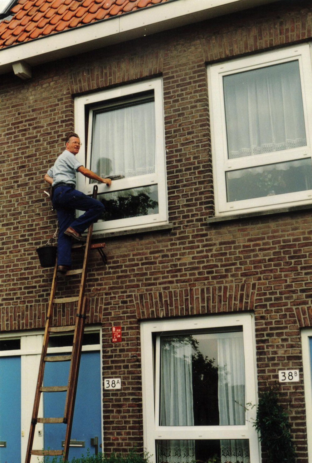 Elke ladder heeft een onderste en een hoogste sport en zo stond Arie vaak op die bovenste sport. Dat was ook nog gevaarlijk. Soms zelfs met één been en de andere zwengelend voor een raam. Dat moest, want anders moest je telkens naar beneden om de leer te verplaatsen.