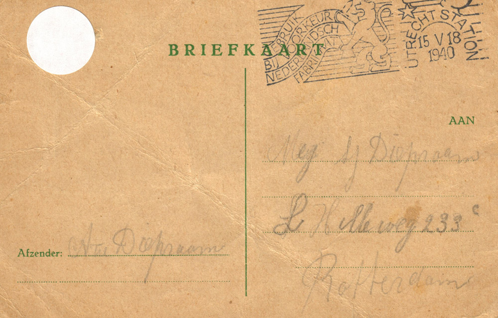Op 15 mei 1940, op de vijfde dag van de Duitse invasie, stuurde Arie een briefkaart naar huis, vanuit Utrecht en op het Station, zoals uit het poststempel blijkt. Mogelijk heeft hij die haastig geschreven, terwijl het bombardement op Rotterdam aan de gang was. Dat begon in de middag van dinsdag 14 mei. Wist hij dat al? Het poststempel op de briefkaart vermeldt 18 uur, zes uur in de namiddag uur dus. Zie de ironie van dat poststempel op de vijfde dag van de Duitse invasie: een leeuw met aan de linkerkant een wimpel waarop staat: Gebruik Bij Voorkeur Nederlandsch Fabrikaat.