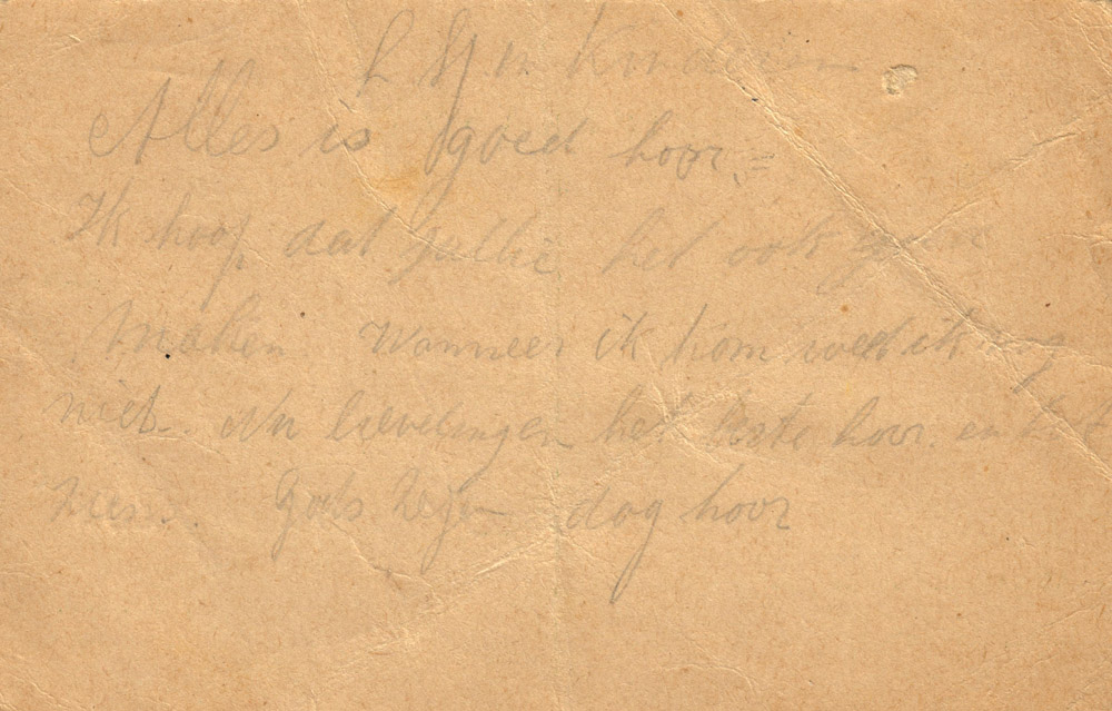Losse zinnetjes, grotendeels half leesbaar. Je moet turen en turen voor je de betekenis achter die flauwe grijze lijntjes op dat gelige papier kunt ontcijferen. Deze briefkaart van Arie is hét ‘oorlogsdocument’ van de Diepraams. Sjoukje heeft hem altijd bewaard.