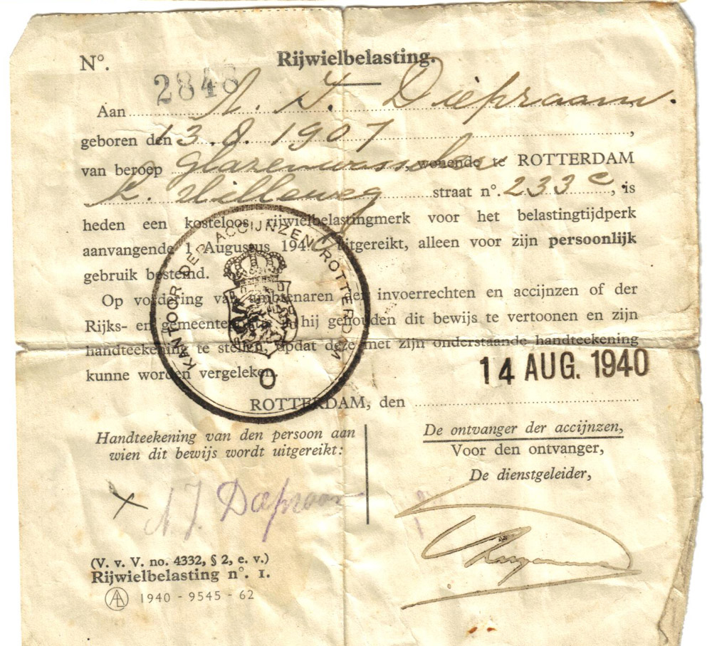 Zoon Han vertelt ons het verhaal van zijn vader. Hij kan uit zijn vroege kinderjaren nog vrij veel voor zijn geestesoog halen. ‘In mijn herinnering zit ik op zijn schouders bij een sinterklaasavond in de stad, zoals iemand uit Rotterdam-Zuid het centrum vroeger noemde. Dat geldt iets minder voor een bezoek aan de plaats Doodewaard waar hij als soldaat gelegerd was. Van alles voor de oorlog staat me dat het beste bij. Ook dat ik voor op zijn fiets zit, op het aan het frame vastgeschroefde kinderzitje en dat ik me vasthoudt aan het stuur. Dat moet toen vaker zijn gebeurd, want ik herinner me heel goed dat mijn vader aangifte deed van een diefstal. Ook het politiebureau zie ik nog voor me. Zelfs staat de plaats van dat bureau me bij; niet dat op het nabije Sandelingenplein, maar aan de Leuvehaven. Ik weet nog hoe hij zijn fiets op slot zette, mij optilde en dat we samen naar binnen gingen. En daar, bij die draaideur van het politiebureau, houdt ze op, die vroege herinnering.’